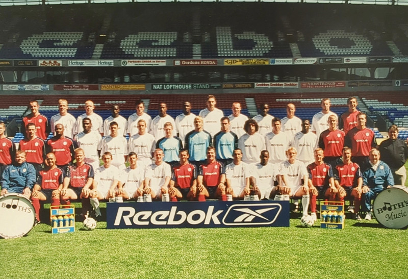 From left to right: Tony & James, the legendary Nat Lofthouse and the club mascot Lofty the Lion. Picture taken around 2000. Below is the squad photo for the 2003 / 2004 season with the Booths drums either side.